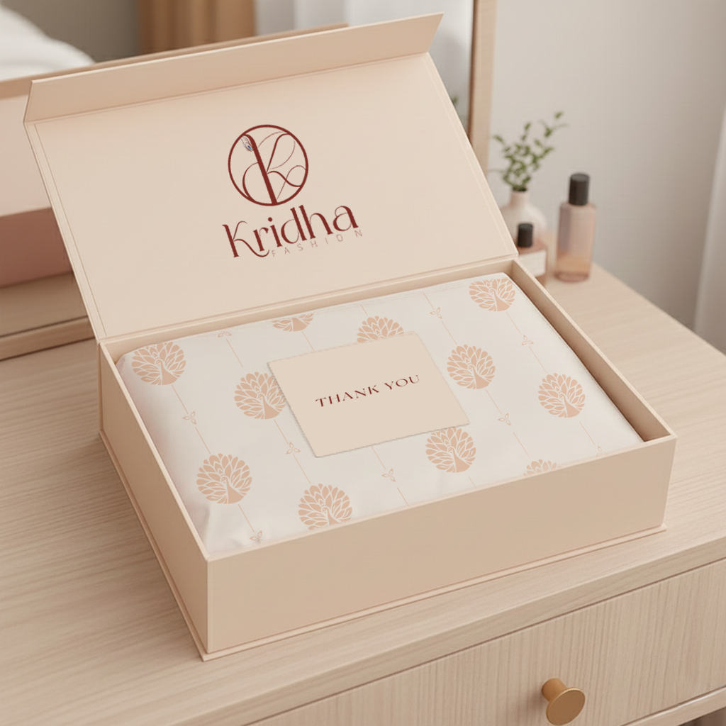 Scribbled Space handled the complete scope of work including branding strategy, logo design, and packaging box, poly bag and shopping bag design, helping Kridha Fashion establish a cohesive and recognisable presence in the Indian ethnic wear market.